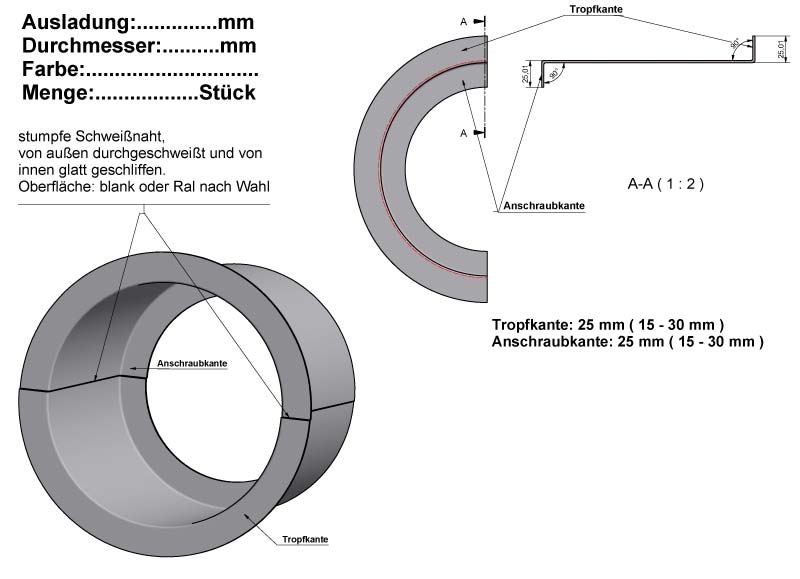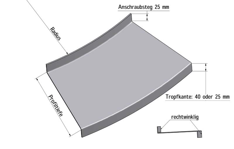 Alle gerundeten Fensterbänke werden mit einer 25iger Tropfkante und mit einem Anschraubsteg von 25 mm Höhe in allen gewünschten Oberflächen geliefert.