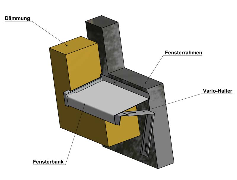Bei Sichtbeton oder Klinkerbauten wird zuerst die Halterung SH 25 auf dem Mauerwerk montiert. Dann wird die Fensterbank so eingeschoben, dass die Halterung in den Rückbug der Traufnase greift.